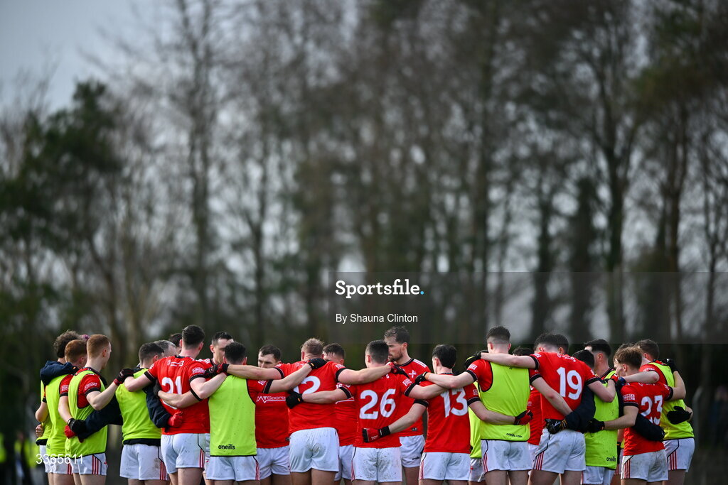 22 February 2026; Louth players huddle before the Allianz Football League Division 2 match between Louth and Tyrone at DEFY Pairc Mhuire in Ardee, Louth. Photo by Shauna Clinton/Sportsfile