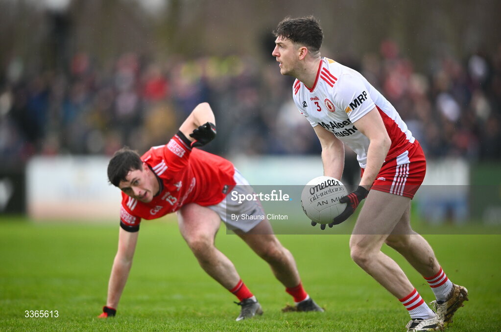22 February 2026; Aidan Clarke of Tyrone in action against Kieran McArdle of Louth during the Allianz Football League Division 2 match between Louth and Tyrone at DEFY Pairc Mhuire in Ardee, Louth. Photo by Shauna Clinton/Sportsfile