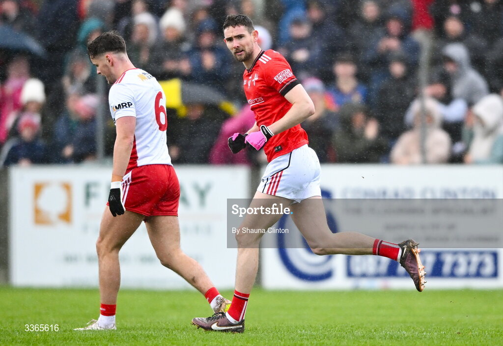22 February 2026; Ciarán Downey of Louth celebrates after scoring his side's first goal during the Allianz Football League Division 2 match between Louth and Tyrone at DEFY Pairc Mhuire in Ardee, Louth. Photo by Shauna Clinton/Sportsfile