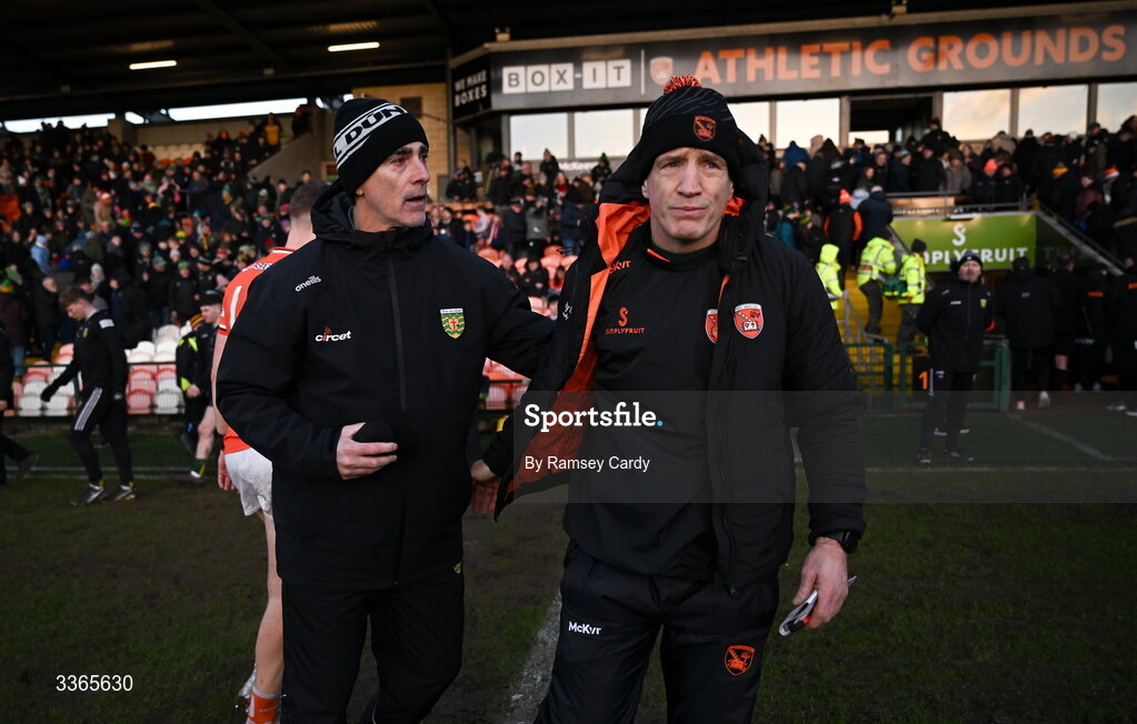 22 February 2026; Donegal manager Jim McGuinness, left, and Armagh manager Kieran McGeeney after the Allianz Football League Division 1 match between Armagh and Donegal at BOX-IT Athletic Grounds in Armagh. Photo by Ramsey Cardy/Sportsfile