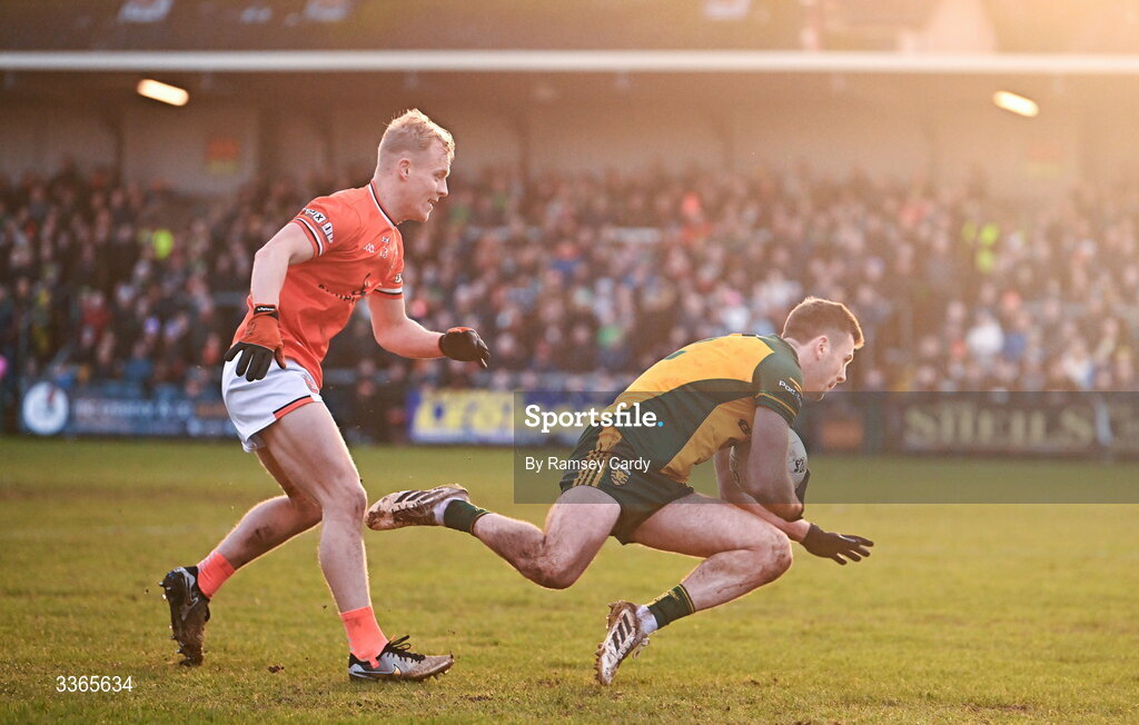 22 February 2026; Eoghan Bán Gallagher of Donegal in action against Cian McConville of Armagh during the Allianz Football League Division 1 match between Armagh and Donegal at BOX-IT Athletic Grounds in Armagh. Photo by Ramsey Cardy/Sportsfile