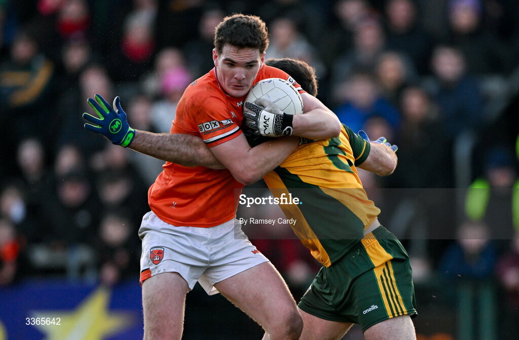 22 February 2026; Jarly Óg Burns of Armagh is tackled by Caolan McGonagle of Donegal during the Allianz Football League Division 1 match between Armagh and Donegal at BOX-IT Athletic Grounds in Armagh. Photo by Ramsey Cardy/Sportsfile