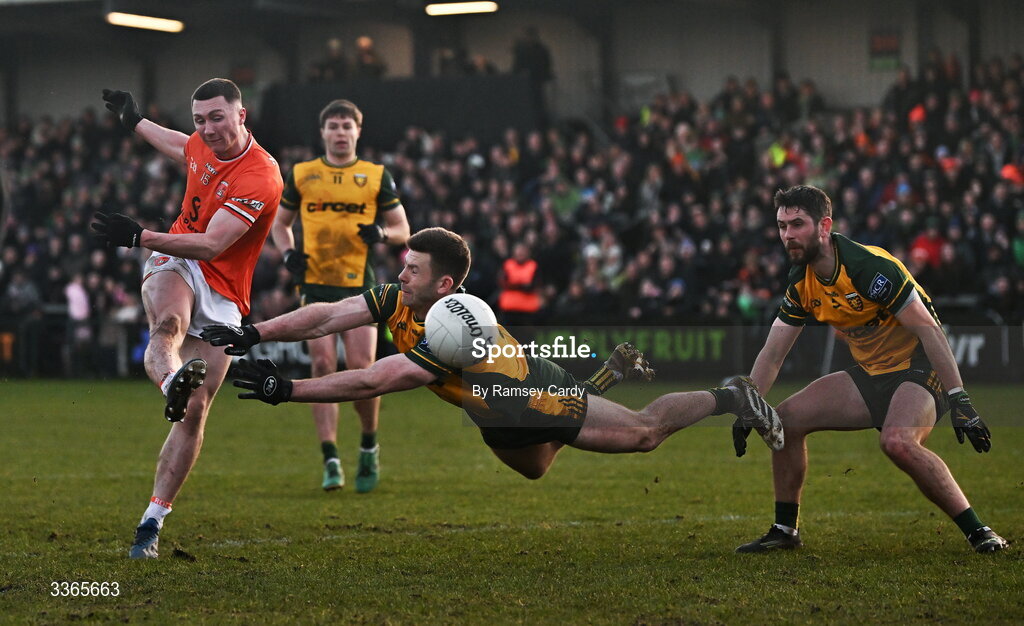 22 February 2026; Oisín Conaty of Armagh shoots under pressure from Eoghan Bán Gallagher of Donegal during the Allianz Football League Division 1 match between Armagh and Donegal at BOX-IT Athletic Grounds in Armagh. Photo by Ramsey Cardy/Sportsfile