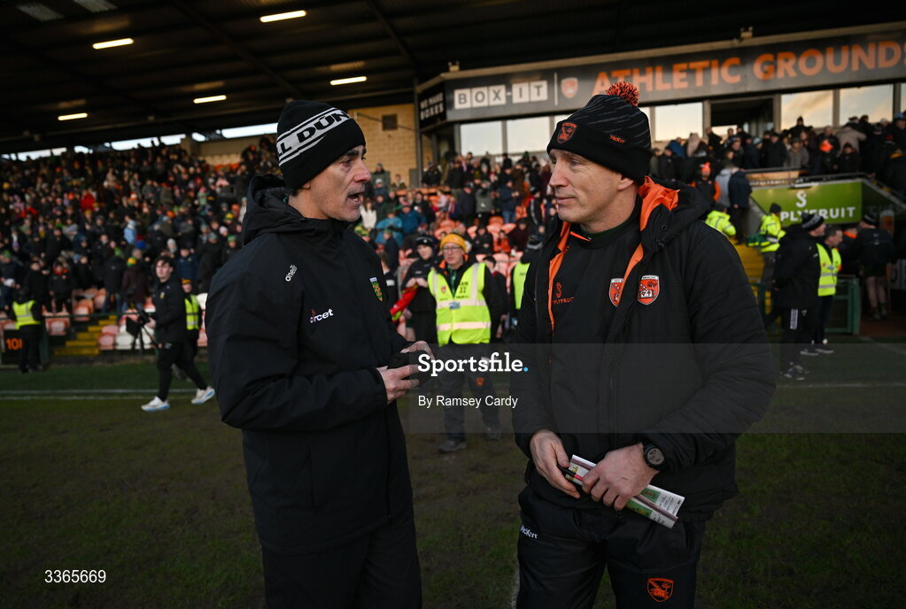 22 February 2026; Donegal manager Jim McGuinness, left, and Armagh manager Kieran McGeeney after the Allianz Football League Division 1 match between Armagh and Donegal at BOX-IT Athletic Grounds in Armagh. Photo by Ramsey Cardy/Sportsfile