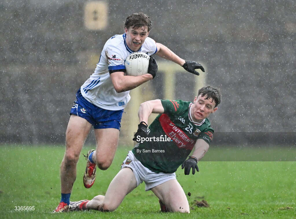 22 February 2026; Karl Gallagher of Monaghan in action against Sean Morahan of Mayo during the Allianz Football League Division 1 match between Monaghan and Mayo at St Tiernach's Park in Clones, Monaghan. Photo by Sam Barnes/Sportsfile