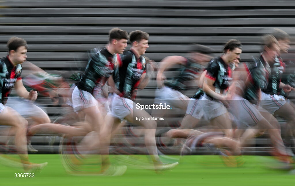 22 February 2026; Mayo players warm up before the Allianz Football League Division 1 match between Monaghan and Mayo at St Tiernach's Park in Clones, Monaghan. Photo by Sam Barnes/Sportsfile