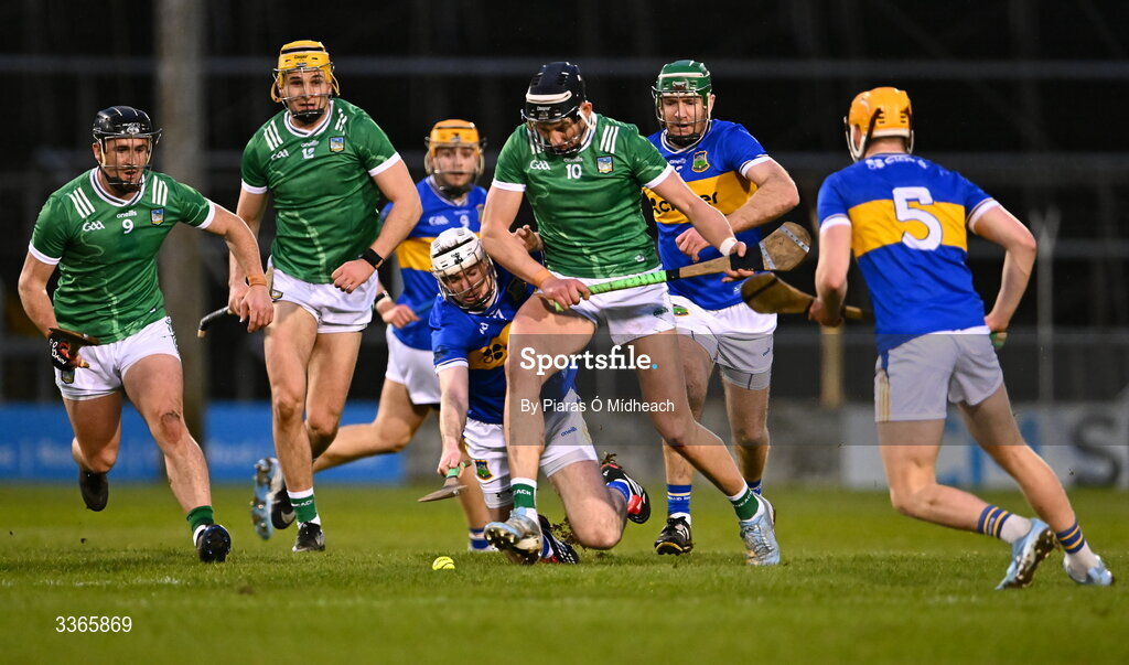 21 February 2026; Gearóid Hegarty of Limerick in action against Séamus Kennedy of Tipperary during the Allianz Hurling League Division 1A match between Tipperary and Limerick at FBD Semple Stadium in Thurles, Tipperary. Photo by Piaras Ó Mídheach/Sportsfile