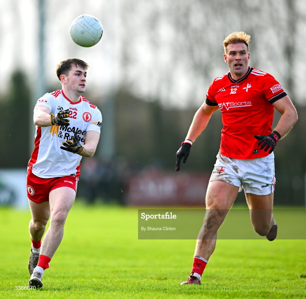 22 February 2026; Cathal Donaghy of Tyrone makes a pass during the Allianz Football League Division 2 match between Louth and Tyrone at DEFY Pairc Mhuire in Ardee, Louth. Photo by Shauna Clinton/Sportsfile
