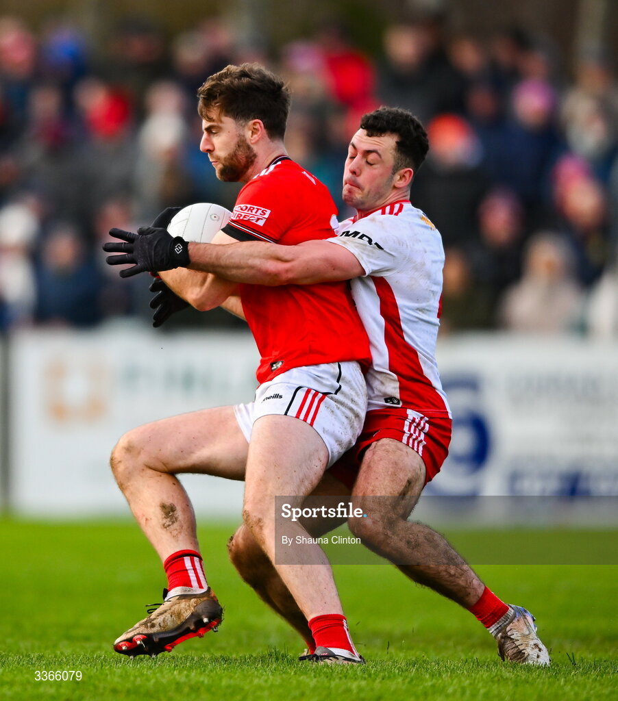 22 February 2026; Dermot Campbell of Louth is tackled by Michael Rafferty of Tyrone during the Allianz Football League Division 2 match between Louth and Tyrone at DEFY Pairc Mhuire in Ardee, Louth. Photo by Shauna Clinton/Sportsfile