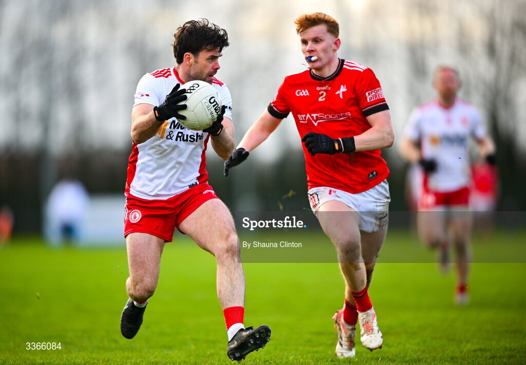 22 February 2026; Ciarán Bogue of Tyrone is tackled by Padraic Tinnelly of Louth during the Allianz Football League Division 2 match between Louth and Tyrone at DEFY Pairc Mhuire in Ardee, Louth. Photo by Shauna Clinton/Sportsfile