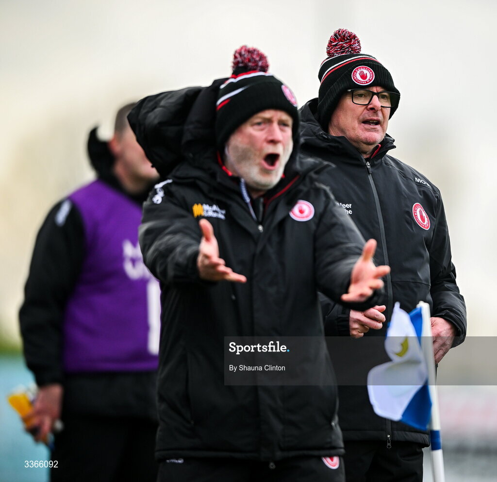 22 February 2026; Tyrone manager Malachy O'Rourke, right, with selector Leo McBride during the Allianz Football League Division 2 match between Louth and Tyrone at DEFY Pairc Mhuire in Ardee, Louth. Photo by Shauna Clinton/Sportsfile
