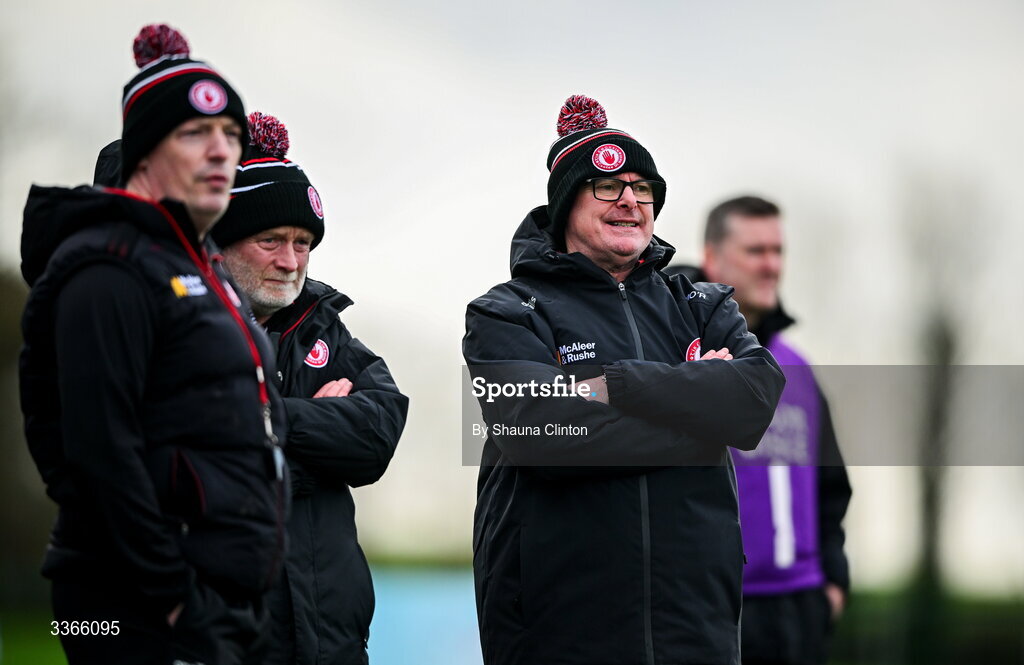 22 February 2026; Tyrone manager Malachy O'Rourke, right, with selector Leo McBride, centre, and coach Ryan Porter during the Allianz Football League Division 2 match between Louth and Tyrone at DEFY Pairc Mhuire in Ardee, Louth. Photo by Shauna Clinton/Sportsfile