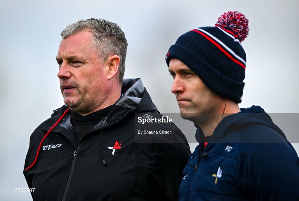 22 February 2026; Louth manager Gavin Devlin, left, and assistant manager Peter Dooley during the Allianz Football League Division 2 match between Louth and Tyrone at DEFY Pairc Mhuire in Ardee, Louth. Photo by Shauna Clinton/Sportsfile