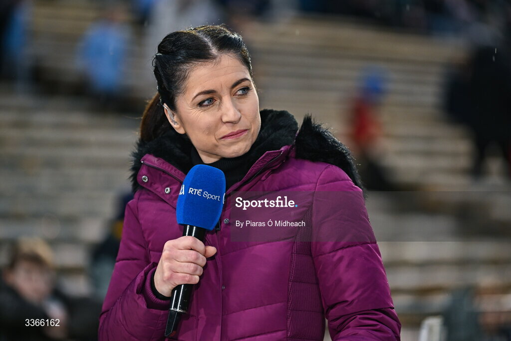 21 February 2026; RTÉ Sport broadcaster Joanne Cantwell before the Allianz Hurling League Division 1A match between Tipperary and Limerick at FBD Semple Stadium in Thurles, Tipperary. Photo by Piaras Ó Mídheach/Sportsfile