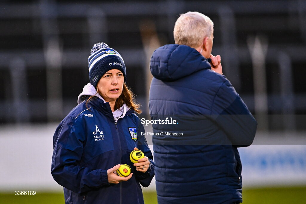 21 February 2026; Limerick sports psychologist Caroline Currid with Limerick manager John Kiely before the Allianz Hurling League Division 1A match between Tipperary and Limerick at FBD Semple Stadium in Thurles, Tipperary. Photo by Piaras Ó Mídheach/Sportsfile