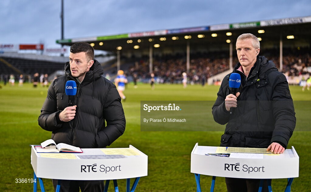 21 February 2026; RTÉ Sport analysts Patrick Horgan, left, and Henry Shefflin before the Allianz Hurling League Division 1A match between Tipperary and Limerick at FBD Semple Stadium in Thurles, Tipperary. Photo by Piaras Ó Mídheach/Sportsfile
