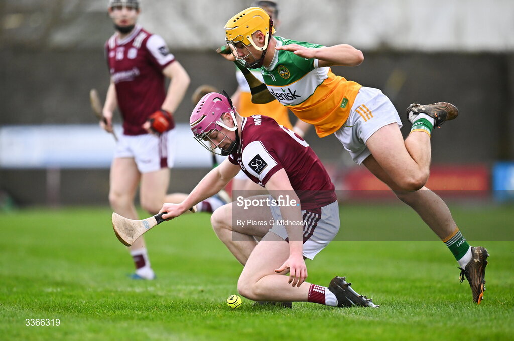 22 February 2026; Conor Doyle of Offaly in action against Cillian Trayers of Galway during the Allianz Hurling League Division 1A match between Offaly and Galway at St Brendan's Park in Birr, Offaly. Photo by Piaras Ó Mídheach/Sportsfile