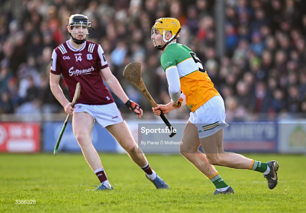 22 February 2026; Donal Shirley of Offaly in action against Jason Rabbitte of Galway during the Allianz Hurling League Division 1A match between Offaly and Galway at St Brendan's Park in Birr, Offaly. Photo by Piaras Ó Mídheach/Sportsfile