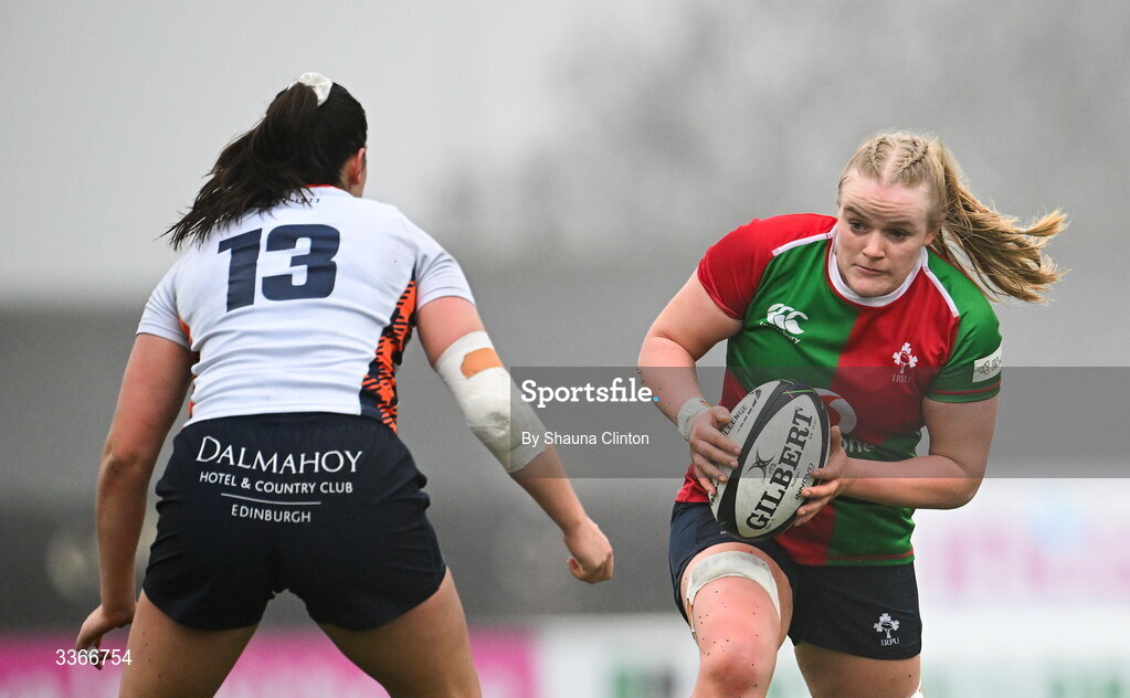 21 February 2026; Ailish Quinn of Clovers in action against Rachel Philipps of Edinburgh during the Celtic Challenge Round 8 match between Clovers and Edinburgh Rugby at Dexcom Stadium in Galway. Photo by Shauna Clinton/Sportsfile