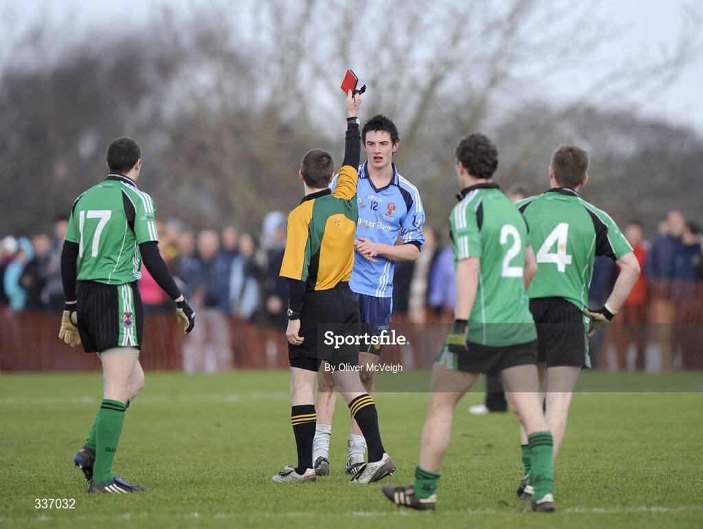 4 February 2009; Niall McKeever, UUJ given a straight Red Card, by Referee, Padraig Hughes, Armagh. Queen's University v University of Ulster Jordanstown, Sigerson Cup, The Dub, Belfast. Picture credit: Oliver McVeigh / SPORTSFILE