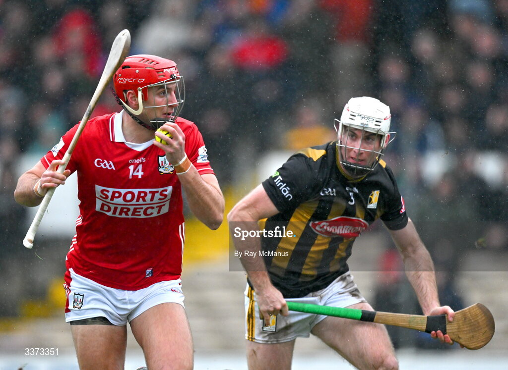 1 March 2026; Brian Hayes of Cork is tackled by Mikey Carey of Kilkenny during the Allianz Hurling League Division 1A match between Kilkenny and Cork at UPMC Nowlan Park in Kilkenny. Photo by Ray McManus/Sportsfile