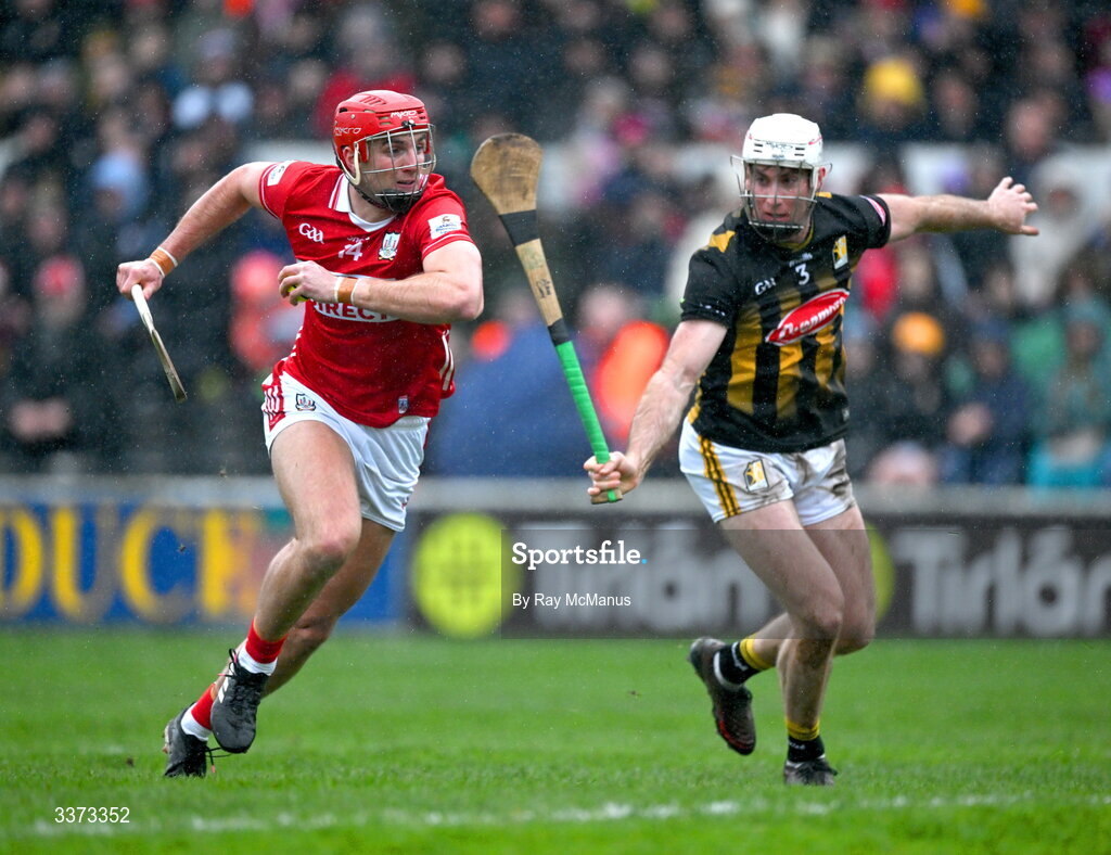 1 March 2026; Brian Hayes of Cork is tackled by Mikey Carey of Kilkenny during the Allianz Hurling League Division 1A match between Kilkenny and Cork at UPMC Nowlan Park in Kilkenny. Photo by Ray McManus/Sportsfile
