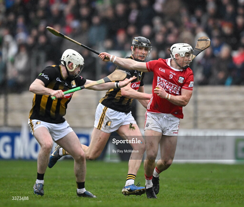 1 March 2026; Tommy O'Connell of Cork is tackled by Jordan Molloy, left, and Darragh Corcoran of Kilkenny during the Allianz Hurling League Division 1A match between Kilkenny and Cork at UPMC Nowlan Park in Kilkenny. Photo by Ray McManus/Sportsfile