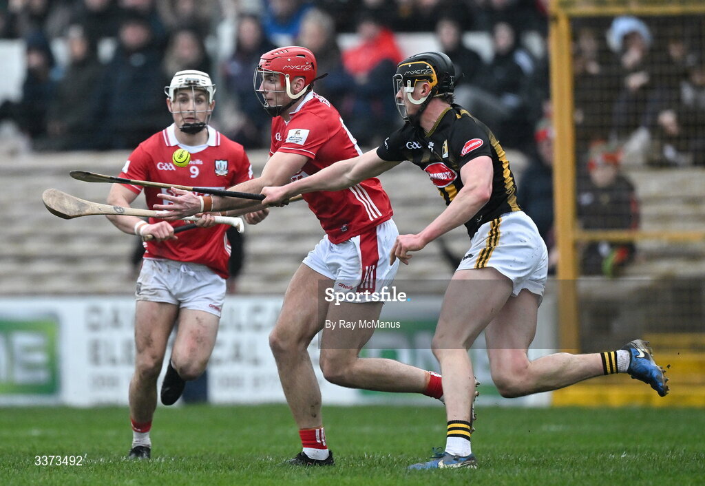 1 March 2026; Brian Hayes of Cork is tackled by Darragh Corcoran of Kilkenny during the Allianz Hurling League Division 1A match between Kilkenny and Cork at UPMC Nowlan Park in Kilkenny. Photo by Ray McManus/Sportsfile