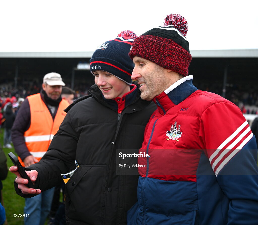 1 March 2026; Cork manager Ben O'Connor poses for a 'selfie' with a young supporter after the Allianz Hurling League Division 1A match between Kilkenny and Cork at UPMC Nowlan Park in Kilkenny. Photo by Ray McManus/Sportsfile