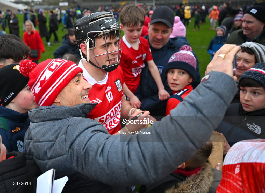 1 March 2026; Darragh Fitzgibbon of Cork signs autographs and poses for 'selfies' after the Allianz Hurling League Division 1A match between Kilkenny and Cork at UPMC Nowlan Park in Kilkenny. Photo by Ray McManus/Sportsfile