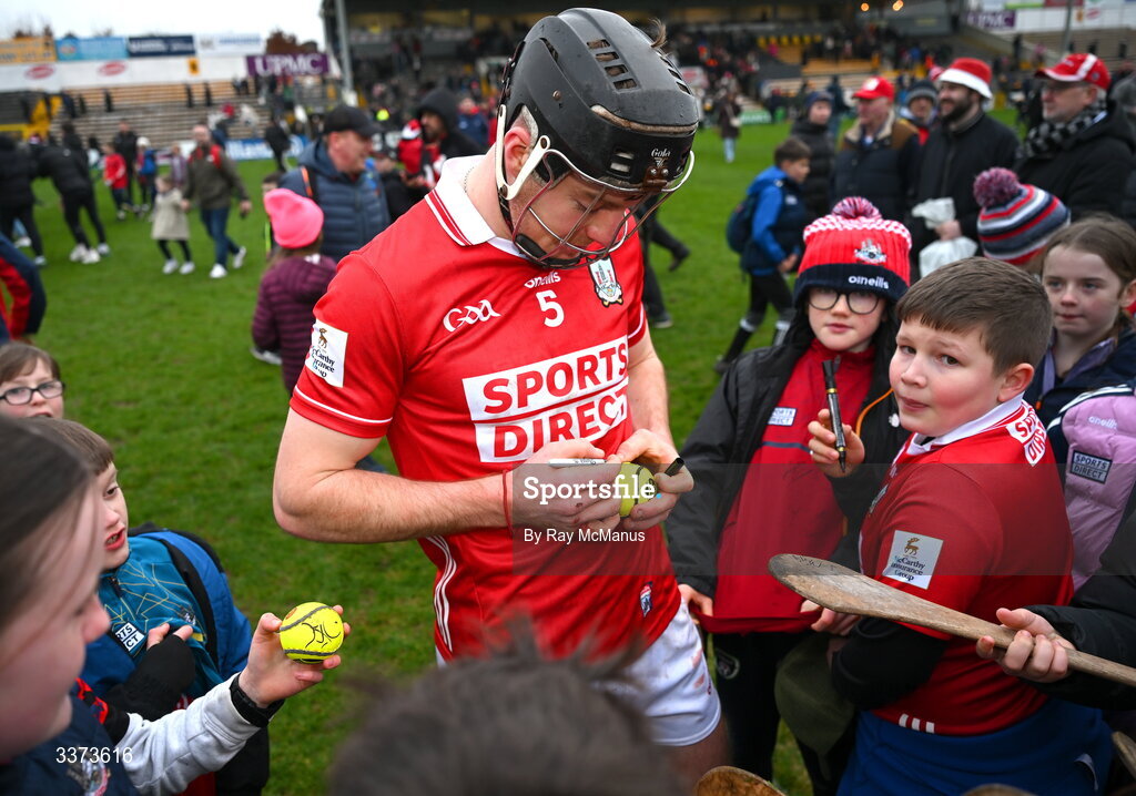 1 March 2026; Eoin Downey of Cork signs his autograph after the Allianz Hurling League Division 1A match between Kilkenny and Cork at UPMC Nowlan Park in Kilkenny. Photo by Ray McManus/Sportsfile