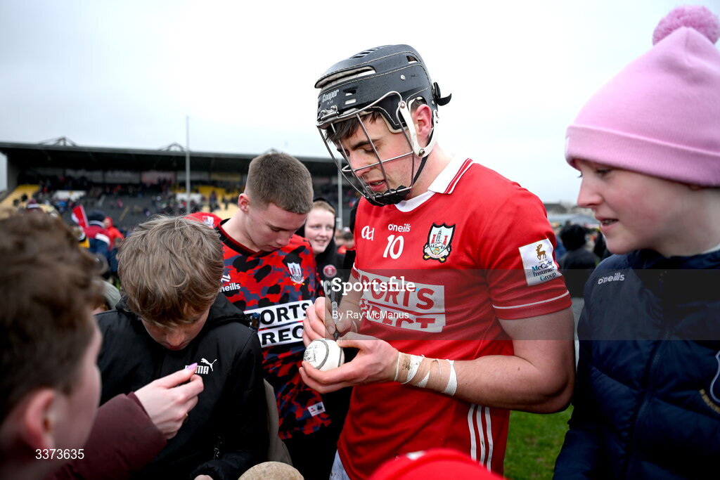 1 March 2026; Eoin Downey of Cork signs a sliotar after the Allianz Hurling League Division 1A match between Kilkenny and Cork at UPMC Nowlan Park in Kilkenny. Photo by Ray McManus/Sportsfile