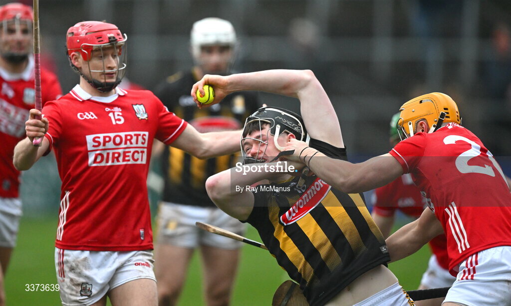 1 March 2026; David Barcoe of Kilkenny is tackled by Micheál Mullins and Damien Cahalane of Cork, left, during the Allianz Hurling League Division 1A match between Kilkenny and Cork at UPMC Nowlan Park in Kilkenny. Photo by Ray McManus/Sportsfile