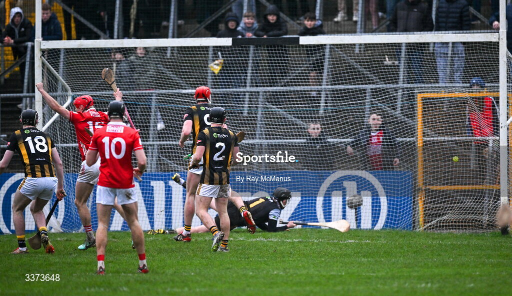 1 March 2026; Cork's Alan Connolly celebrates as Kilkenny goalkeeper Aidan Tallis is beaten for a Cork goal during the Allianz Hurling League Division 1A match between Kilkenny and Cork at UPMC Nowlan Park in Kilkenny. Photo by Ray McManus/Sportsfile
