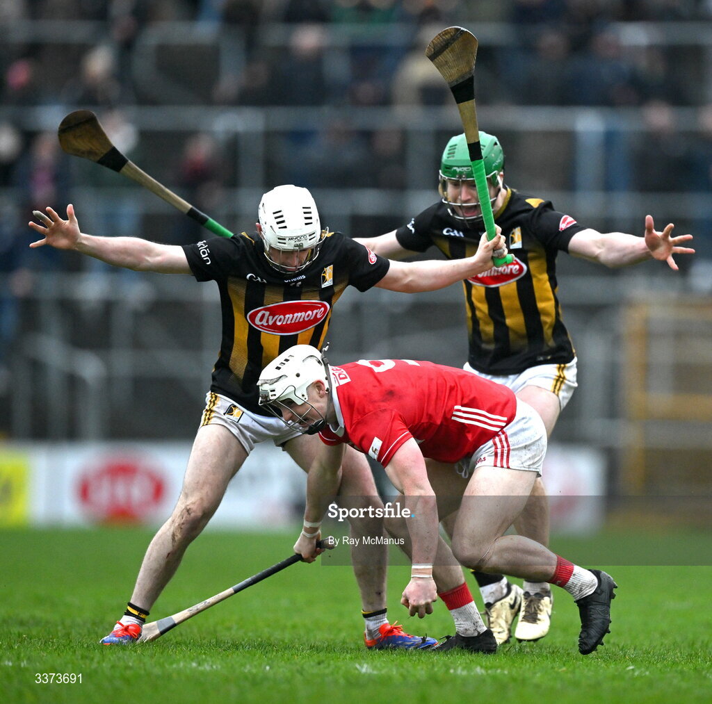 1 March 2026; Tommy O'Connell of Cork is tackled by Cian Kenny, left, amd Mossy Keoghan of Kilkenny during the Allianz Hurling League Division 1A match between Kilkenny and Cork at UPMC Nowlan Park in Kilkenny. Photo by Ray McManus/Sportsfile