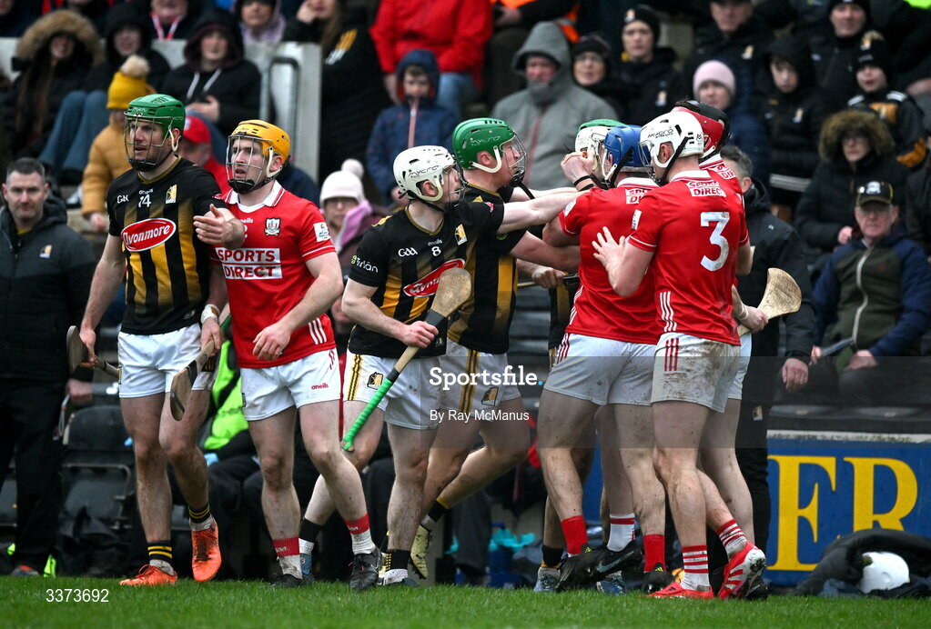 1 March 2026; Players from both sides jostle each other during the Allianz Hurling League Division 1A match between Kilkenny and Cork at UPMC Nowlan Park in Kilkenny. Photo by Ray McManus/Sportsfile