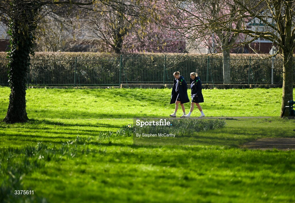 3 March 2026; Republic of Ireland head coach Carla Ward, right, and Ruesha Littlejohn during a team walk near their hotel ahead of the 2027 FIFA Women’s World Cup Qualifier match between Republic of Ireland and France at Tallaght Stadium in Dublin. Photo by Stephen McCarthy/Sportsfile