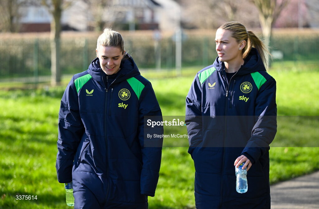 3 March 2026; Republic of Ireland's Saoirse Noonan and Jamie Finn, left, during a team walk near their hotel ahead of the 2027 FIFA Women’s World Cup Qualifier match between Republic of Ireland and France at Tallaght Stadium in Dublin. Photo by Stephen McCarthy/Sportsfile