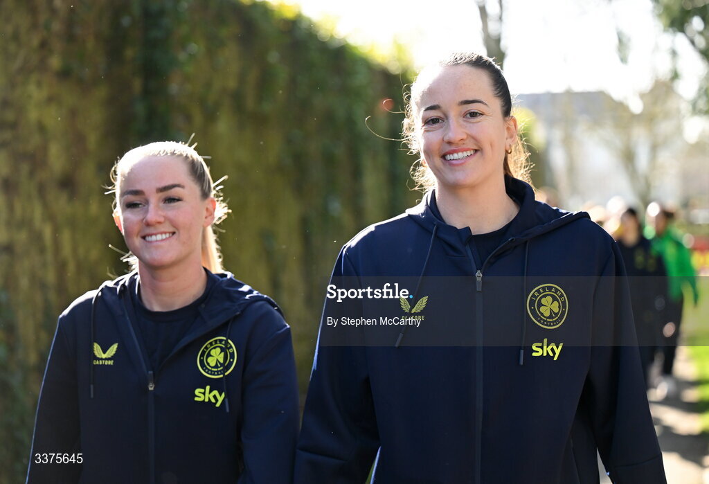 3 March 2026; Republic of Ireland's Anna Patten, right, and Jessie Stapleton during a team walk near their hotel ahead of the 2027 FIFA Women’s World Cup Qualifier match between Republic of Ireland and France at Tallaght Stadium in Dublin. Photo by Stephen McCarthy/Sportsfile