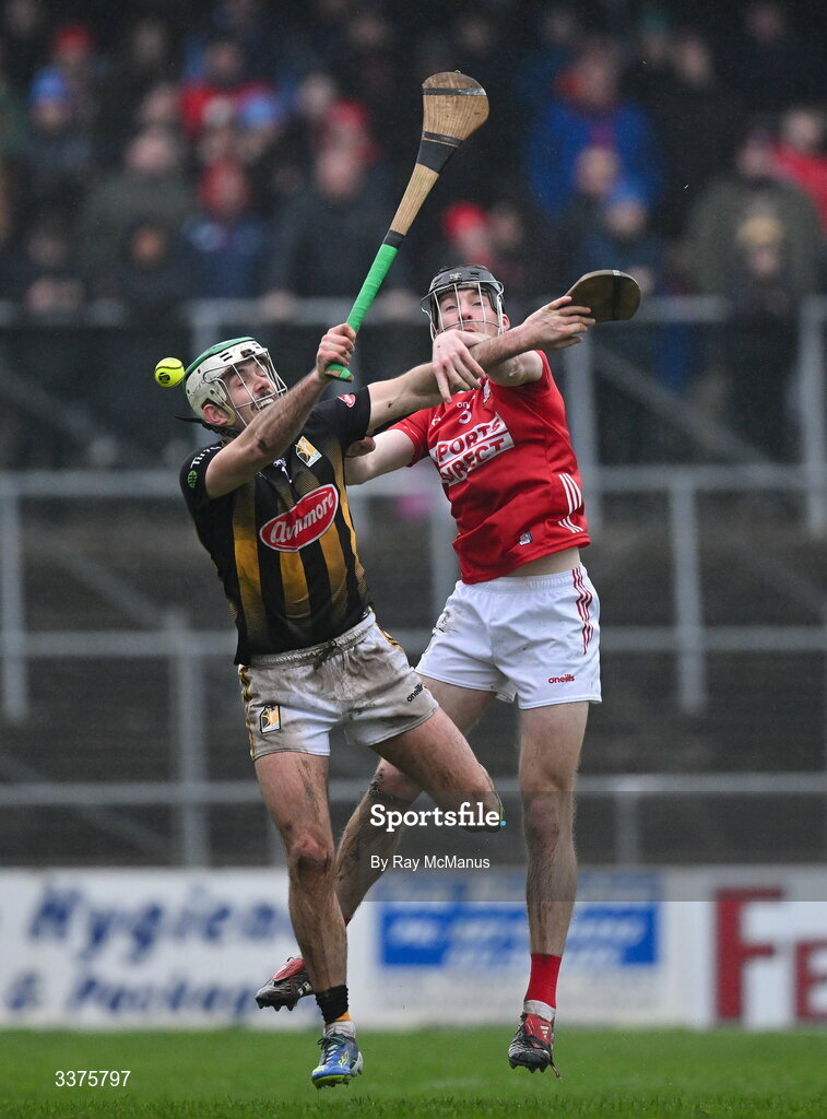 1 March 2026; Paddy Deegan of Kilkenny is tackled by Eoin Downey of Cork during the Allianz Hurling League Division 1A match between Kilkenny and Cork at UPMC Nowlan Park in Kilkenny. Photo by Ray McManus/Sportsfile