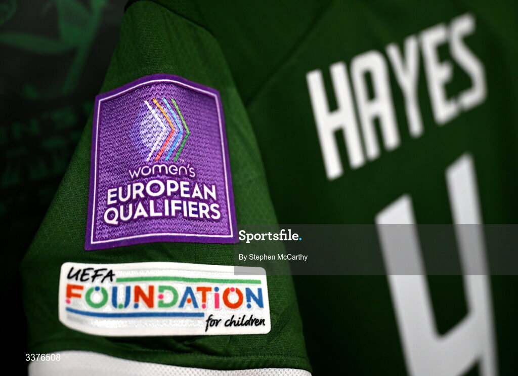 3 March 2026; A detailed view of the competition sleeve on the jersey of Caitlin Hayes of Republic of Ireland is seen in the dressing room before the 2027 FIFA Women’s World Cup Qualifier match between Republic of Ireland and France at Tallaght Stadium in Dublin. Photo by Stephen McCarthy/Sportsfile