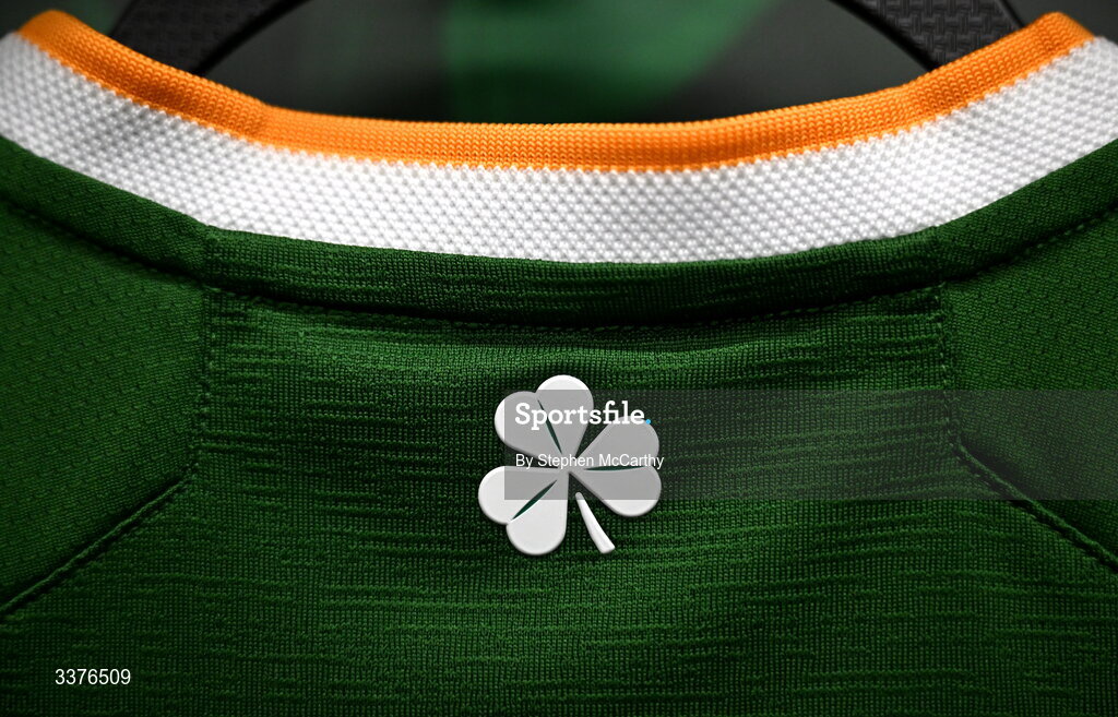 3 March 2026; A detailed view of an Republic of Ireland jersey in the dressing room before the 2027 FIFA Women’s World Cup Qualifier match between Republic of Ireland and France at Tallaght Stadium in Dublin. Photo by Stephen McCarthy/Sportsfile