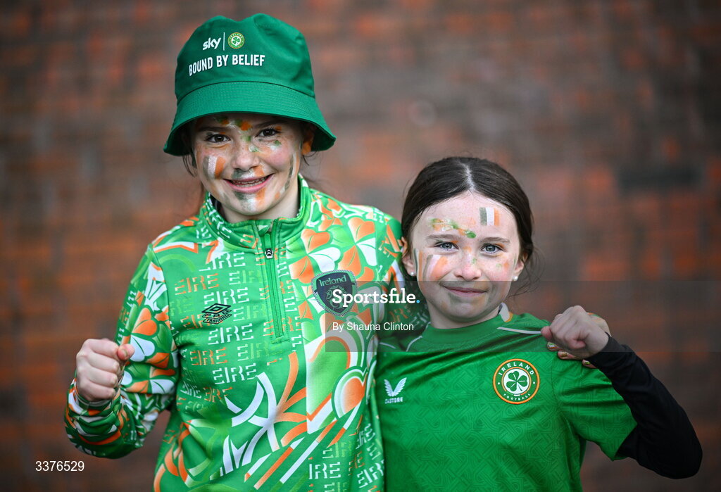 3 March 2026; Republic of Ireland supporter Ruby Griffin, left, and Anna Connolly, from Galway, before the 2027 FIFA Women’s World Cup Qualifier match between Republic of Ireland and France at Tallaght Stadium in Dublin. Photo by Shauna Clinton/Sportsfile