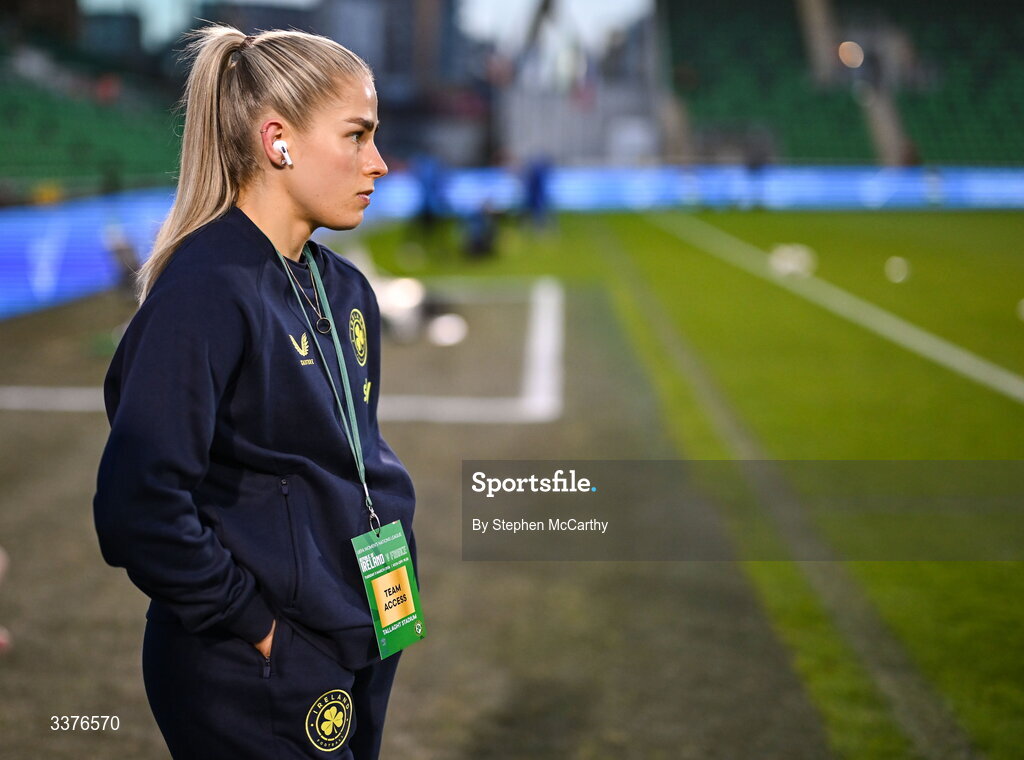 3 March 2026; Tara O'Hanlon of Republic of Ireland walks the pitch before the 2027 FIFA Women’s World Cup Qualifier match between Republic of Ireland and France at Tallaght Stadium in Dublin. Photo by Stephen McCarthy/Sportsfile