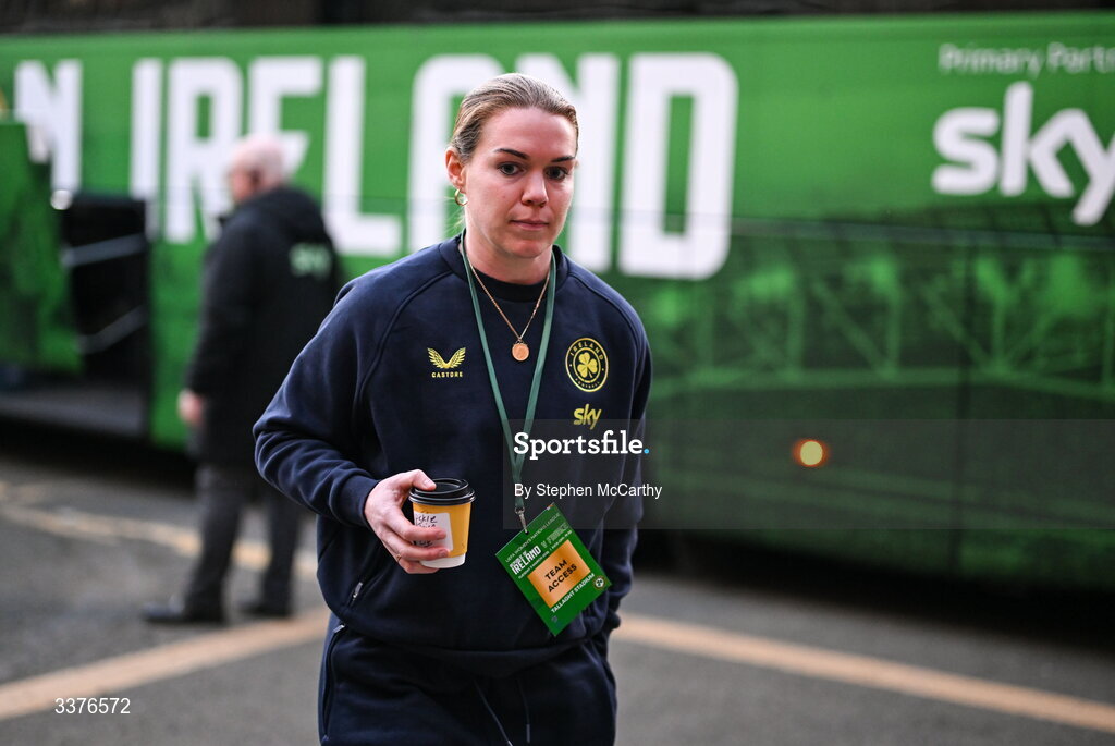 3 March 2026; Aoife Mannion of Republic of Ireland arrives for the 2027 FIFA Women’s World Cup Qualifier match between Republic of Ireland and France at Tallaght Stadium in Dublin. Photo by Stephen McCarthy/Sportsfile
