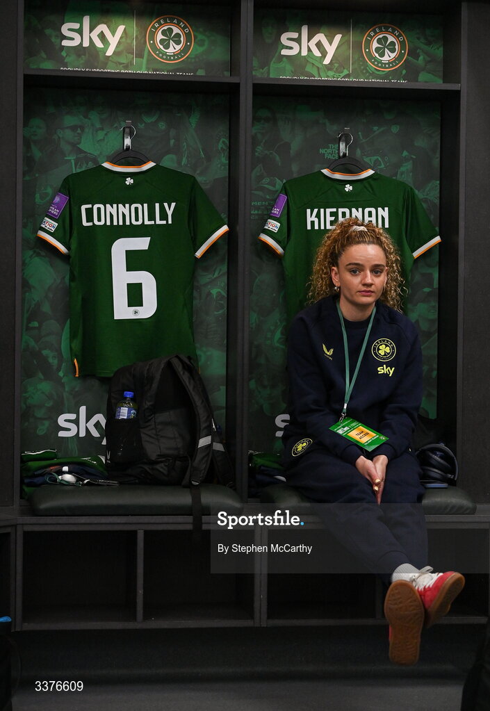 3 March 2026; Leanne Kiernan of Republic of Ireland in the dressing room before the 2027 FIFA Women’s World Cup Qualifier match between Republic of Ireland and France at Tallaght Stadium in Dublin. Photo by Stephen McCarthy/Sportsfile