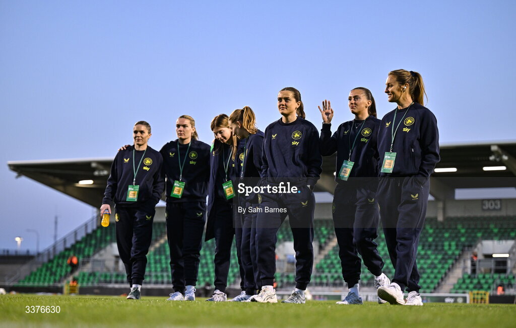 3 March 2026; Republic of Ireland players walks the pitch before the 2027 FIFA Women’s World Cup Qualifier match between Republic of Ireland and France at Tallaght Stadium in Dublin. Photo by Sam Barnes/Sportsfile
