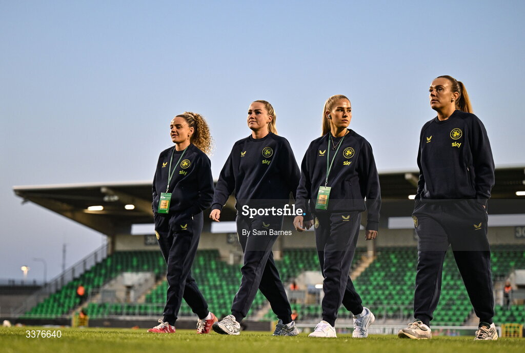 3 March 2026; Republic of Ireland players, from left, Leanne Kiernan, Jessie Stapleton, Tara O'Hanlon and Grace Moloney walk the pitch before the 2027 FIFA Women’s World Cup Qualifier match between Republic of Ireland and France at Tallaght Stadium in Dublin. Photo by Sam Barnes/Sportsfile