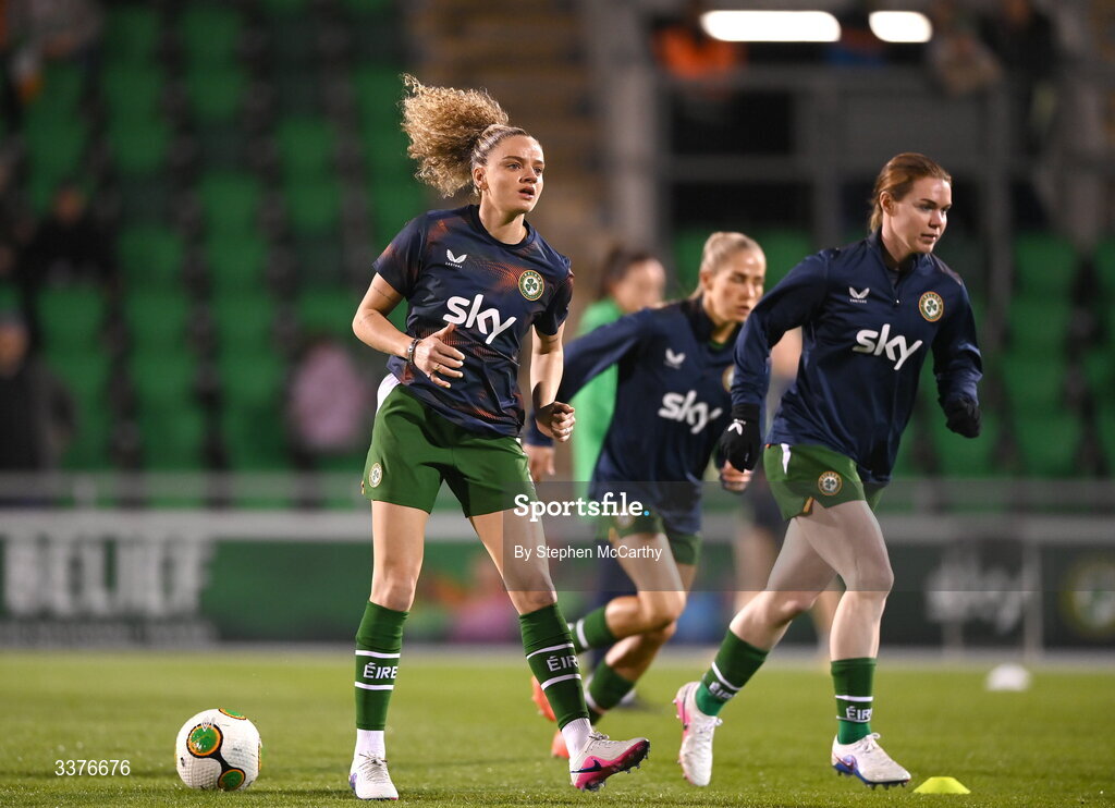 3 March 2026; Leanne Kiernan, left, and Aoife Mannion of Republic of Ireland warm up before the 2027 FIFA Women’s World Cup Qualifier match between Republic of Ireland and France at Tallaght Stadium in Dublin. Photo by Stephen McCarthy/Sportsfile