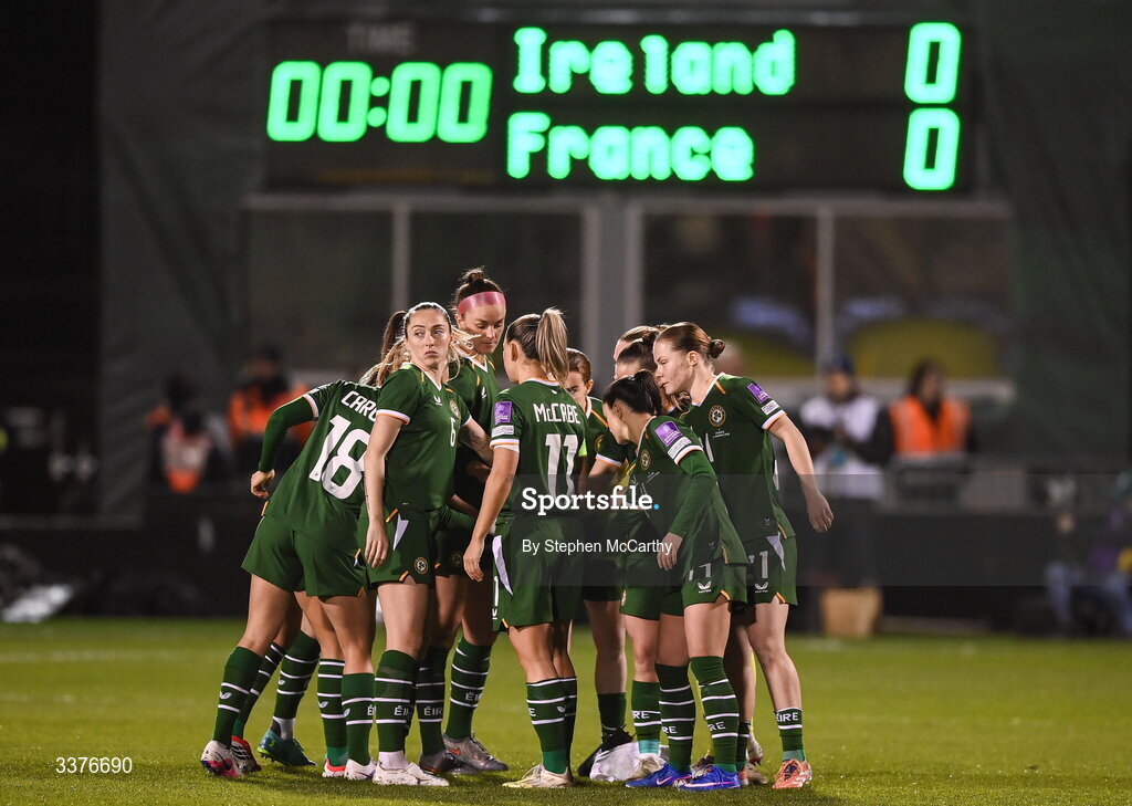 3 March 2026; Republic of Ireland players in a team huddle before the 2027 FIFA Women’s World Cup Qualifier match between Republic of Ireland and France at Tallaght Stadium in Dublin. Photo by Stephen McCarthy/Sportsfile